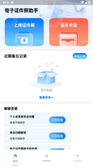 首页设有证件照上传、证件卡包功能,还支持添加备忘记录。