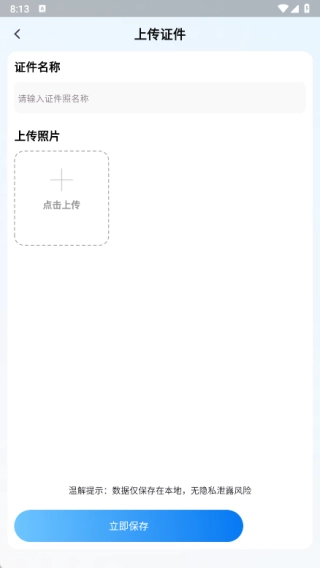 2、进入上传证件页面后,先填写证件照的名称,接着上传对应的照片,最后点击立即保存按钮就完成了。