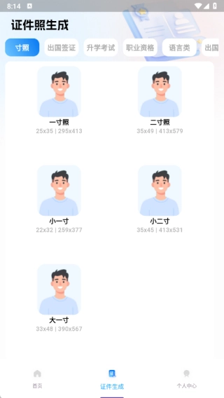4、证件生成页面提供多种不同规格的寸照模板,能够随时快速完成制作。