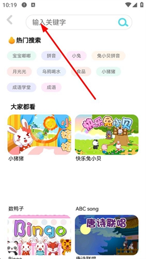 4、登录后可进入搜索页面,在搜索框中输入关键字,也可以选择热门搜索内容,以此查找所需的儿歌等资源。