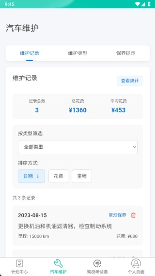2、在汽车维护页面,用户能够查看维护记录、了解维护类型以及获取保养提示等相关服务。