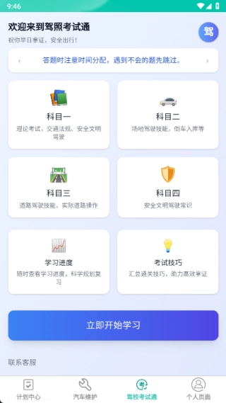 启程悦驾是一个能让你及时获取驾考知识的平台,它提供了多项核心服务,方便你随时知晓不同的规划操作,更高效地掌握全面的驾考知识;同时,你还能了解各类学车规划,轻松明晰各类驾考信息,快速学习汽车维护相关知识。