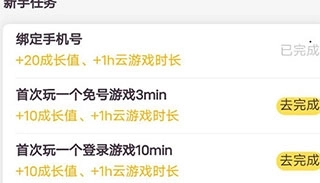 2、新手任务:完成其中的新手任务也能获得时长增加,通过绑定手机号和试玩云游戏的方式,可在任务中增加对应的时长。