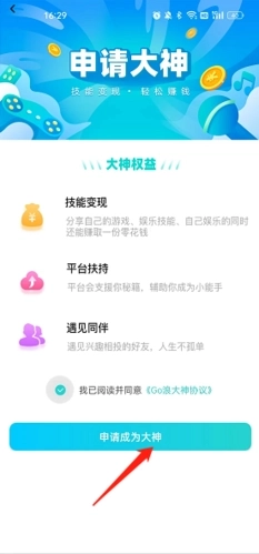 2、点击“申请成为大神”选项,按照步骤进行操作。申请成为大神之后,就可以技能变现,轻松赚钱。