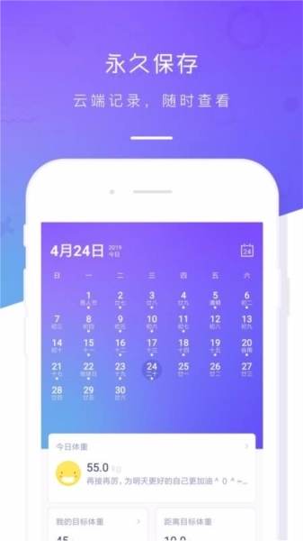1、设有可记录信息的日历功能,只需选定日期,就能录入当日体重数据并选择对应的满意度;