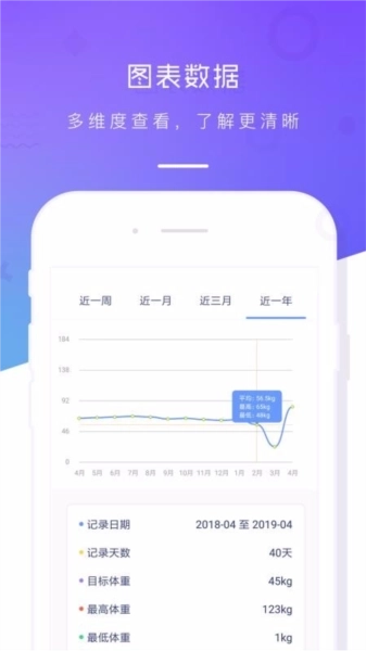 4、支持多维度查看图表数据,让用户能清晰掌握体重信息,系统还会自动完成数据统计;