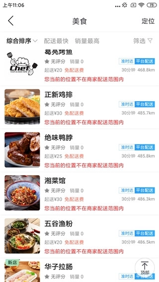 4、点击美食外卖,根据你的位置进行定位,匹配各种好吃的美食。