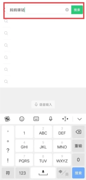 1、微信页面,输入文字妈妈驿站,点击搜索