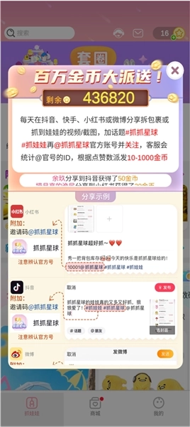 •【星球社区】:全新社区功能已正式上线啦!赶紧来这儿分享你在星球上收获的满满快乐吧~还能秀出你的抓娃娃超能力,轻松圈粉无数哦!