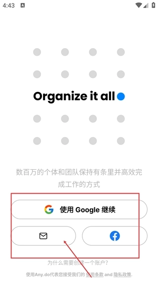 1、在【Organize-it-all】对应的界面里,能够选择【使用-Google-继续】、邮箱或者Facebook等途径。
