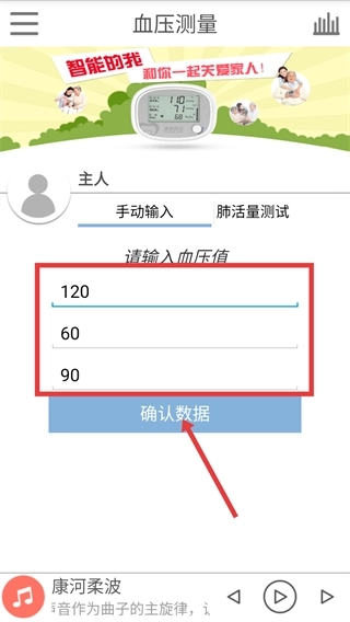 2、把收缩压、舒张压和脉搏的数值都填写好之后,点击“确认数据”按钮,就能提交已经输入的健康数据了。