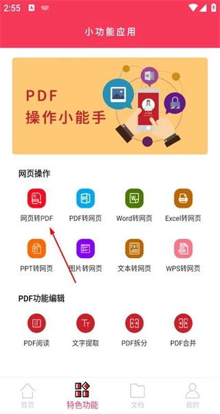 4、登录系统后进入特色功能页面,能看到网页操作、PDF功能编辑等不同板块,点击“网页转PDF”选项,即可开展相关的转换操作。