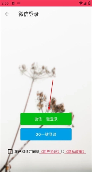 3、在登录页面勾选用户协议与隐私政策,然后点击微信一键登录按钮,即可完成账号登录流程。