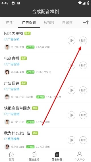 3、在广告促销分类下找到目标配音案例后,点击其右侧的“制作”按钮,即可进入该配音的编辑制作界面。