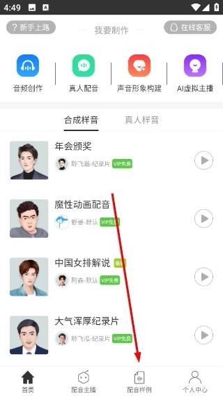1、在配音平台首页,点击底部的“配音样例”选项,就能进入合成配音样例页面,查看各类配音案例。