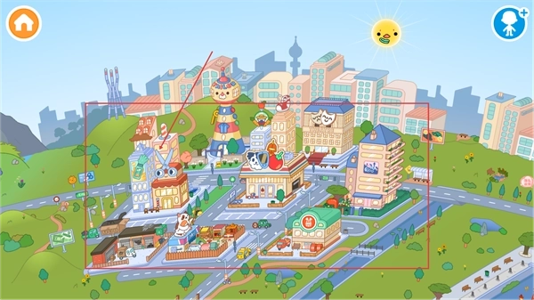 1、打造卡通星球风格的场景,融入各类建筑与装饰元素,箭头所指的播放按钮是互动入口,点击该按钮即可进入对应的场景功能模块。