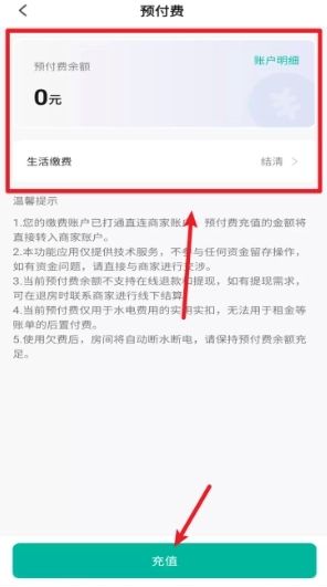 5、若需要缴纳相关费用,可进入预付费页面查询账户余额及账单情况,点击页面底部的充值按钮即可完成线上支付操作。