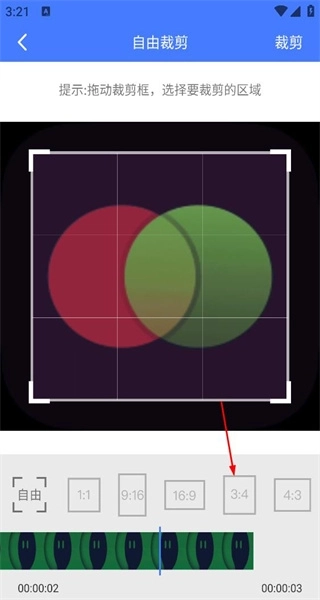 3、进入自由裁剪页面后,找到视频画面和比例选项,选择3:4的裁剪比例,再调整裁剪区域的范围。