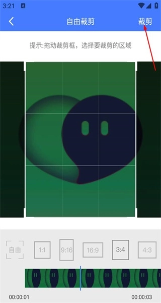 4、确定好裁剪的区域和比例后,点击右上角的裁剪按钮,即可完成该视频的自由裁剪操作。