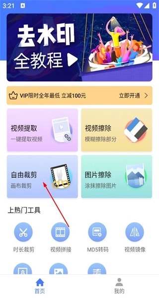 1、启动软件进入首页后,找到视频提取等功能区域,点击自由裁剪选项即可进入视频选择界面。
