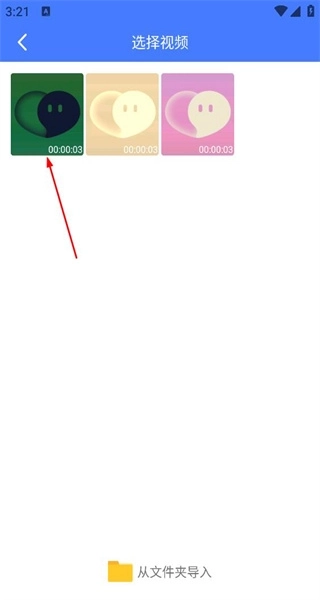 2、进入视频选择页面后,浏览页面上展示的视频文件,找到时长为3秒且封面为绿色的视频,点击该视频进入裁剪页面。