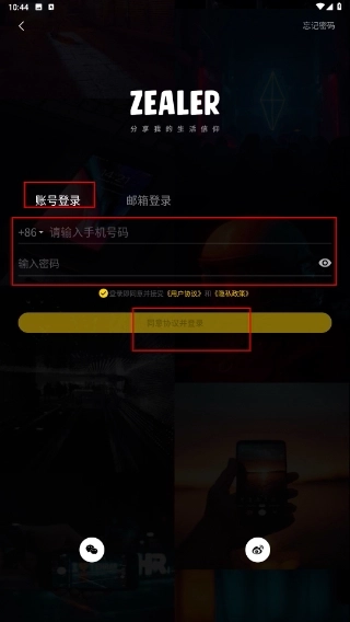 1、打开ZEALER应用后,仔细阅读《用户协议与隐私政策》的相关内容,随后点击“同意”按钮,即可进入账号登录页面。