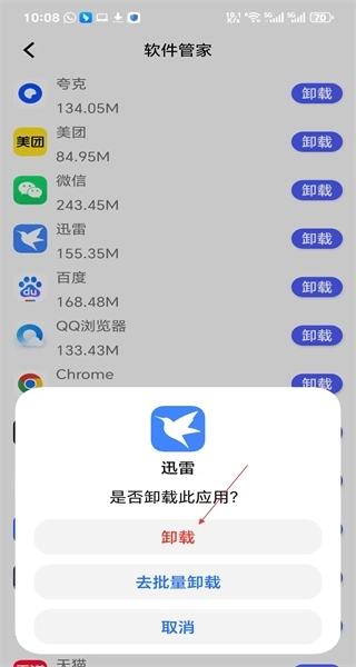进入软件管家界面后,能看到已安装的各类软件清单,找到迅雷并点击其卸载按钮。