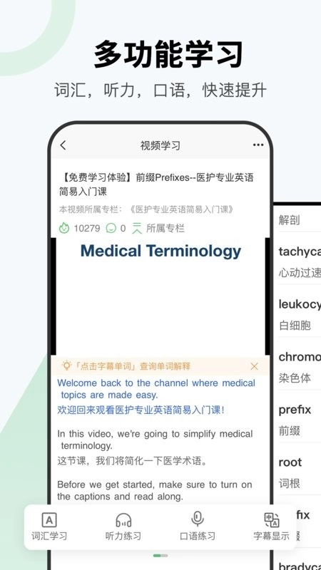 创新性地研发出屏幕取词功能,能够即时查询专业术语的释义、发音以及临床应用实例,并借助词根记忆法来提高学习效率。