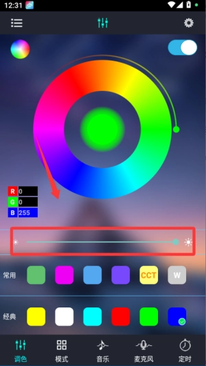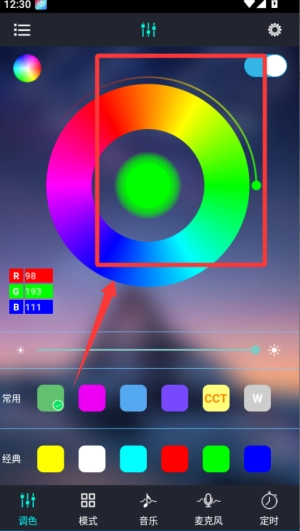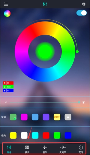 打开宝莲灯后,先连接支持的LED灯设备,连接成功后即可在手机上操控灯光,通过滑动来调节亮度和选择颜色,操作既简单又直观。