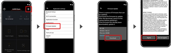 在智能手机上打开LUMIX Sync应用程序,点击右上角的菜单,选择“固件更新”选项,然后依照提示步骤操作即可。