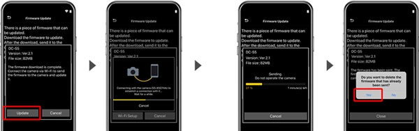 当您用Wi-Fi把智能手机和相机连接起来时,固件会发送至相机并启动更新流程。更新完成后请将其删除。