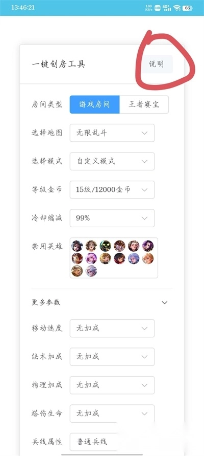 打开王者创房工具软件,点击一键创房工具右侧的说明按钮;
