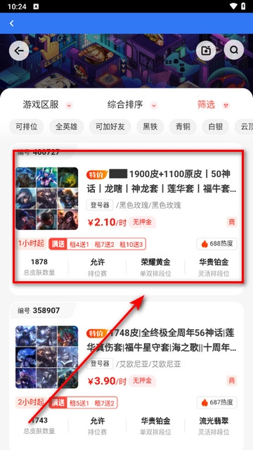 选择好后,选择并点击进入你要租借的游戏账号。