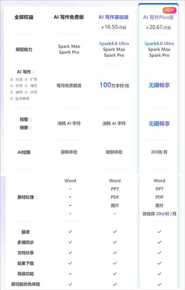基础的写作与文档处理相关功能均可免费使用,仅部分进阶功能需开通会员权限解锁,下方呈现的是讯飞写作的付费权益详情表。