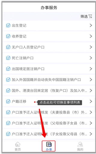 点击“办事”可切换至办事列表;
