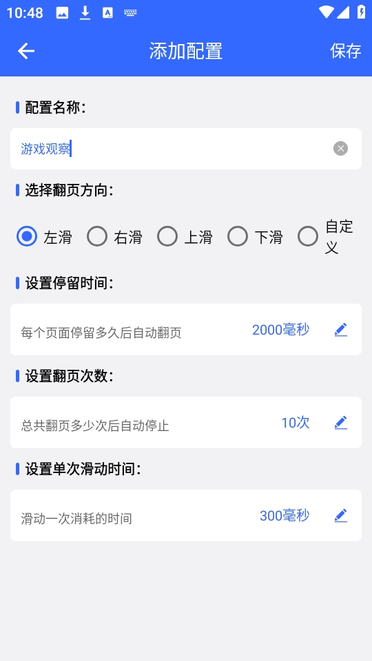 5、还可以自定义配置名称,停留时间,翻页次数,单次滑动时间等相关参数。
