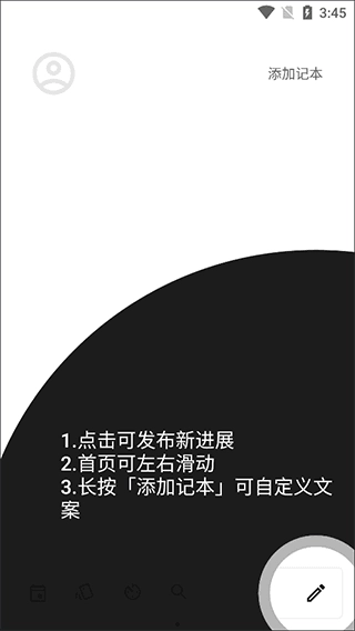 在这个平台完成登录并进入主界面后,第一次使用时点击界面右下角的功能键就能发布最新动态;若需要个性化表达,长按“新建笔记”选项即可自定义文字内容。