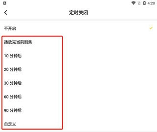 2、在里面设定关闭的时间,比如播放完当前剧集、10分钟后,或者是去自定义;