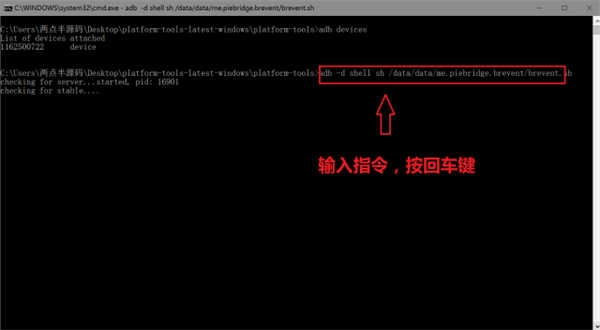 当手机设备连接好后,输入“.\\adb -d shell sh /data/data/me.piebridge.brevent/brevent.sh”这条命令就能完成授权操作。