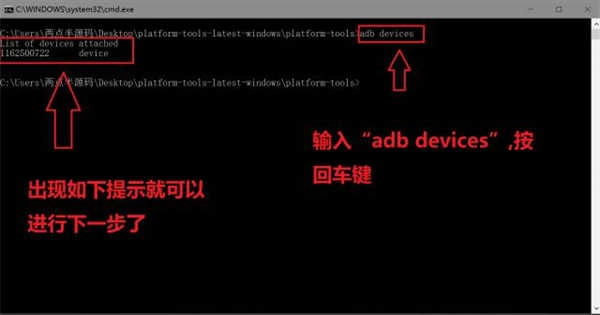 当命令窗口弹出来后,输入“.\\adb devices”这串指令,就能看到已经成功连接的手机设备了。