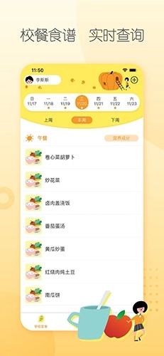 2、在这里,家长可以查阅三周学校食谱,并直观展示其营养成分,解决孩子吃饭的各种问题,是家长们关注孩子饮食营养的必备助手。