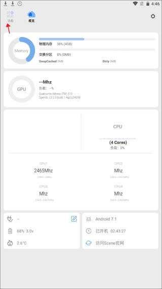 这里展示了帧率记录、充电统计、耗电统计等功能,你可以点击下方红色箭头所指的位置来重新选择工作模式。
