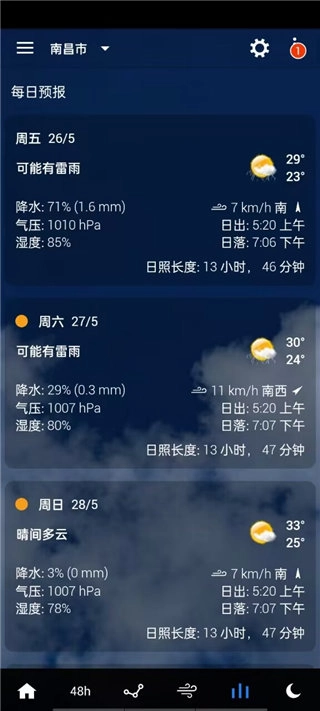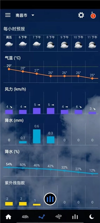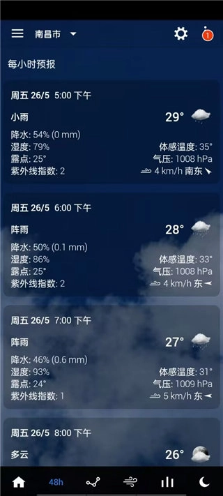 点击48h板块,我们查看当前城市48小时内每小时的天气情况。