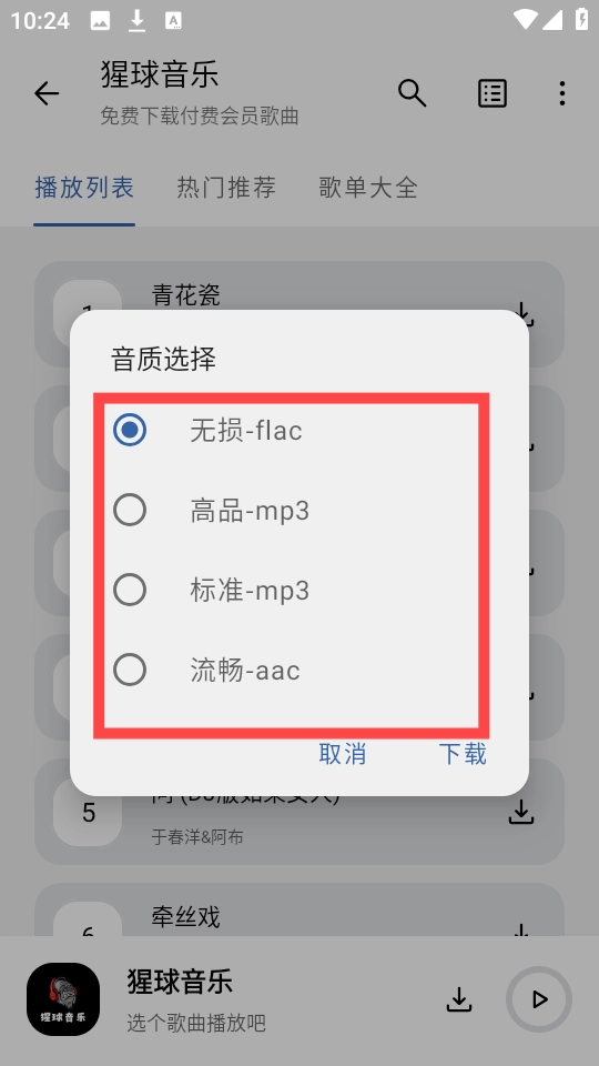 猩球音乐,支持免费畅听各类热门付费歌曲,为用户提供多种音质选择。用户无需付费,就能体验高品质的音乐播放效果。平台具备歌曲下载功能,让用户在离线状态下也能畅享音乐。此外,一键搜索功能可帮助用户快速找到喜爱的音乐内容。