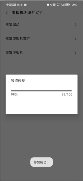 4、等它修复到99.会提示修复成功,然后就卡在这里,不必理会。