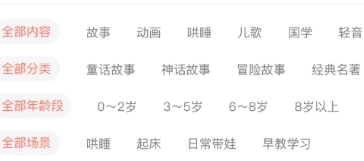 【所有类别】童话故事、绘本故事、神话故事、睡前故事、寓言故事、成语故事、名人故事、双语故事、英文儿歌、中文儿歌、诗词歌赋、亲子教育、传统节日、传统节气、中外经典、少儿英语、语文