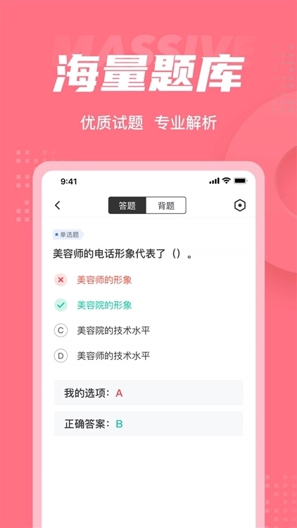 美容师考试聚题库专业化内容架构与智能化学习设计,为美容师资格备考提供了高效解决方案。其分级题库精准匹配考试要求,专项模块直击绘画等难点题型,让备考更具针对性。智能错题归类与进度追踪功能,帮助考生清晰掌握薄弱环节,避免盲目刷题。简洁的界面设计与多场景适配特性,完美契合备考人群碎片化学习需求。这种将职业考试特点与现代学习技术深度融合的设计,不仅提升了备考效率,更让专业知识学习变得系统有序,成为美容行业从业者职业晋升的得力助手。