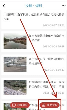 打开中国环境,在首页点击唤出【投稿/爆料】功能。