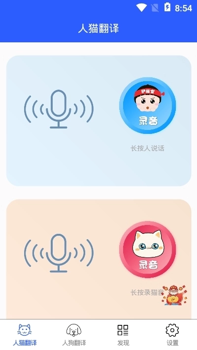 可以和喵星人对话沟通,按住说话键,您想表达的内容就会转化为猫咪能听懂的语音传递过去;而猫咪发出的叫声,也能借助这款软件完成翻译。