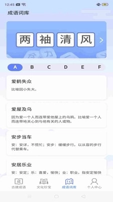 2、帮助提升成语词汇量,成语按首字母分类进行检索,所有成语都可进行解析学习